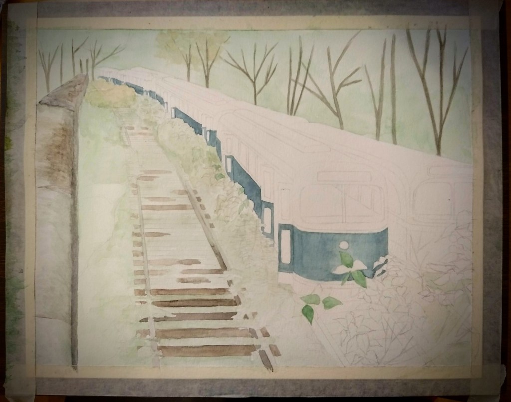 It amazes me a little when I see artists who start with one corner or feature of their artwork and complete that in detail before moving onto the next segment, because I simply can’t do it. I’m more of a “work all over” sort of person. As I mentioned in my last post, I sometimes do a sketch or a rough drawing of a composition before I put it on watercolor paper, especially if I’m creating a piece that I don’t have a reference photo for. That happens to be the case for the painting above, for which I’m using a couple different reference photos with different perspectives. I sketched out two different potential compositions in my sketchbook, chose the one I liked better from there, and sketched a larger version onto watercolor paper. I drew in a few of the details in the foreground foliage (which you can see in the bottom right corner of the image below) and a few of the tree trunk lines, but left the rest of the plant life more or less to chance. To me, getting the perspective and detail correct in the trains and the tracks was more important, so I drew those in more fully.