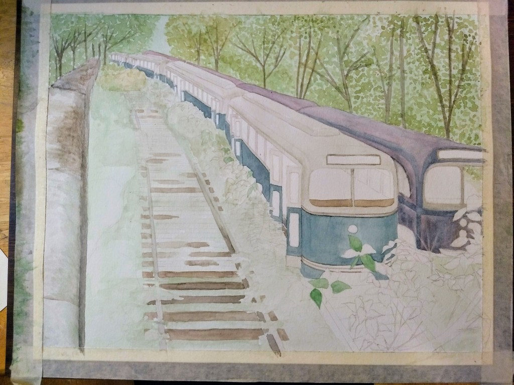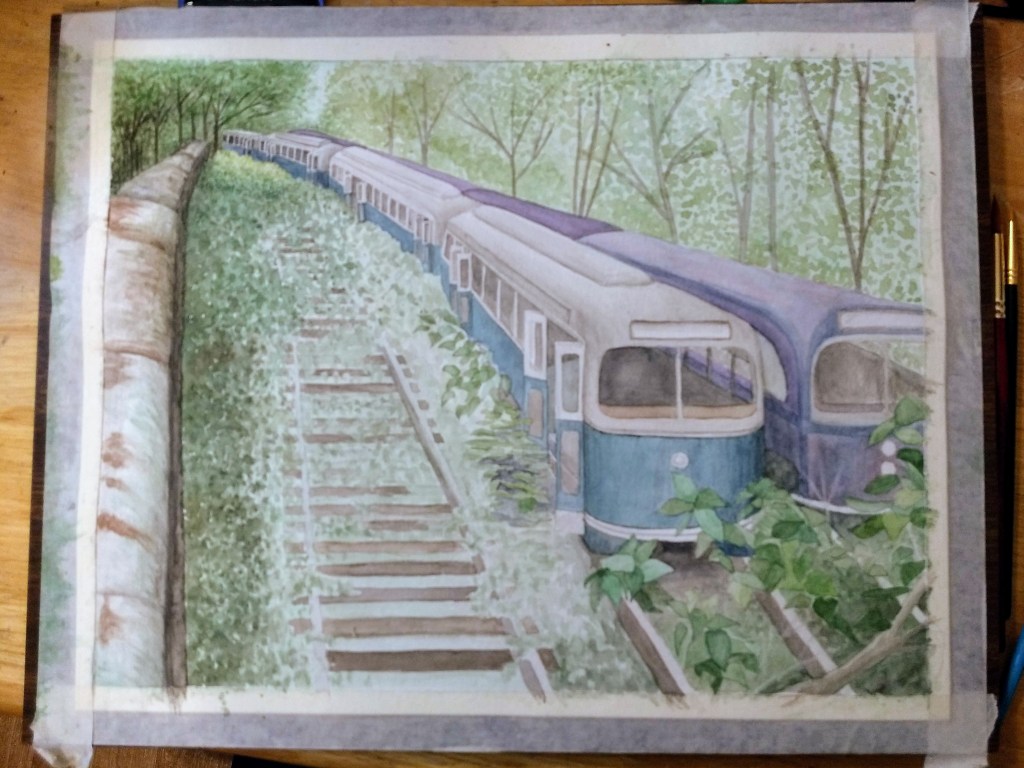 Here, you can see how I worked once I began the painting. I mapped out the visible tree trunks and railroad tracks, and painted light green washes over most of the background foliage. I also added the first wash of color to the most visible trains.