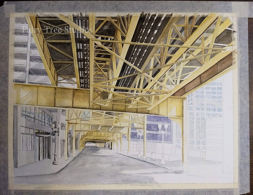 First off, a painting based on a photo I took in Chicago last spring — I love the L and how it integrates with the city; actually, I think I just like trains in general. I got a good ways into this, as you can see, before I got distracted by… something. (I always have several projects going at once; I’ve never been good at focusing on one thing at a time.)