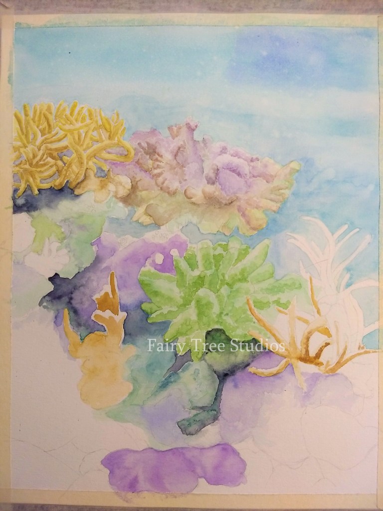 Second, also based on a photo taken in Chicago (this one at Shedd Aquarium), a cluster of colorful underwater creatures. This one was fun because the fact that everything IS underwater means I can paint in a slightly looser style. Both of these paintings were started at our last house, before we bought and moved into our new one.