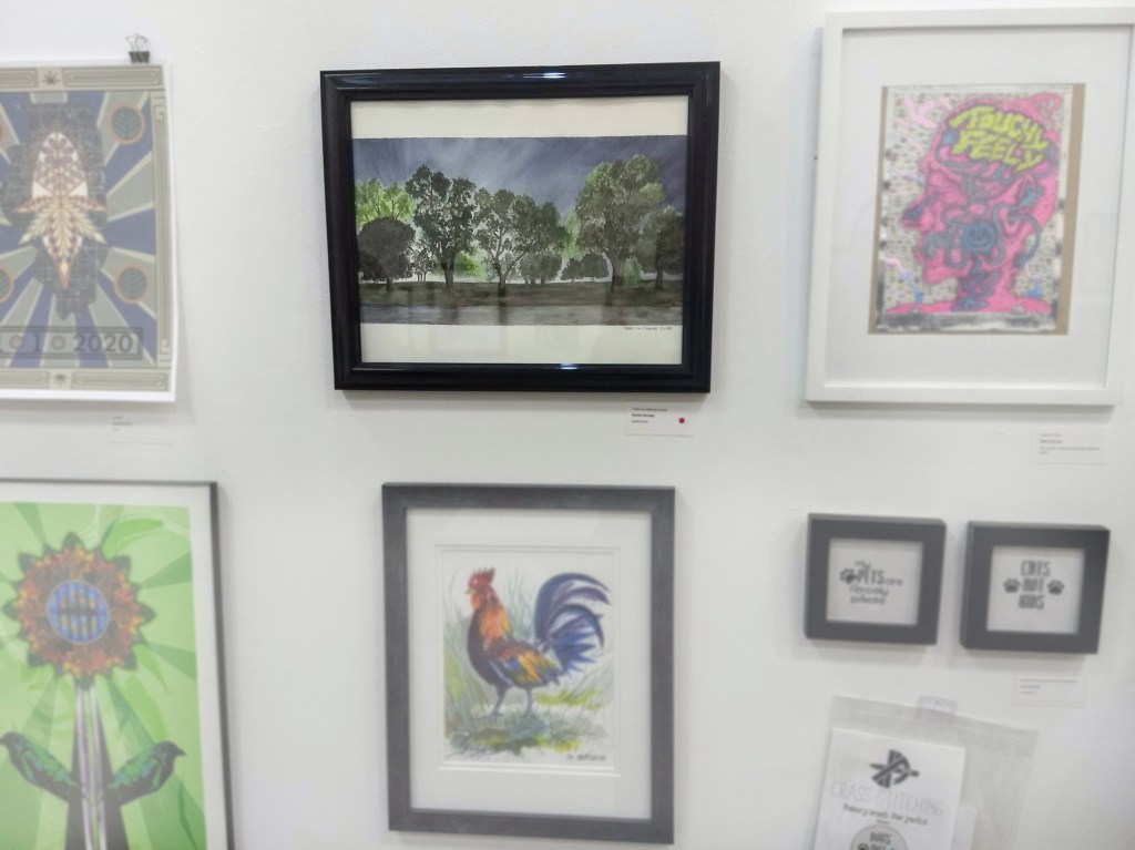 Part of the benefit of the fundraiser was an opening night reception, which offered the chance to see your own art hanging with all the other donated pieces, and/or a chance to snap up the pieces you wanted to buy ASAP (though the gallery was open through the month of December for people to browse at their convenience). There were also snacks and wine. The reception ran during a two-hour window; Jake and I dropped by about half an hour in to check it out. I found my piece on the wall, delighted in seeing it hanging there like a legitimate piece of art, and took a picture. I also noticed that it, along with about 1/3 of the other pieces in the gallery, had a little red dot on the title card. “What does that mean?” I asked a friendly, chatty lady who’d greeted me upon entering the gallery.