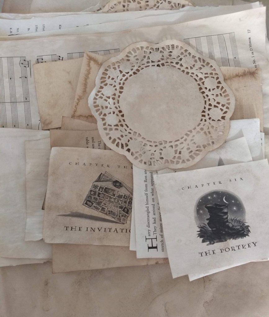 Annnnd I coffee dyed my own paper for the first time on Sunday, with pretty decent results. I did some experimenting with already-brewed grounds (trying to be economical) but the pages were still pretty light. So I followed the instructions in a Youtube video which said to use a cup of fresh coffee grounds and three cups of water, and got closer to what I wanted.