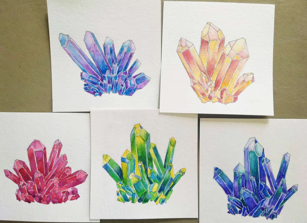 This month, I finished my lilac painting (just added to the gallery!) but didn’t touch my green tractor painting (see last month’s studio check-in if you’re wondering what the heck I’m talking about). I did a small commissioned piece and then traced out some of my crystal drawings to paint myself, since they really are fun to do. Here they are: