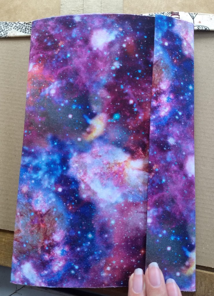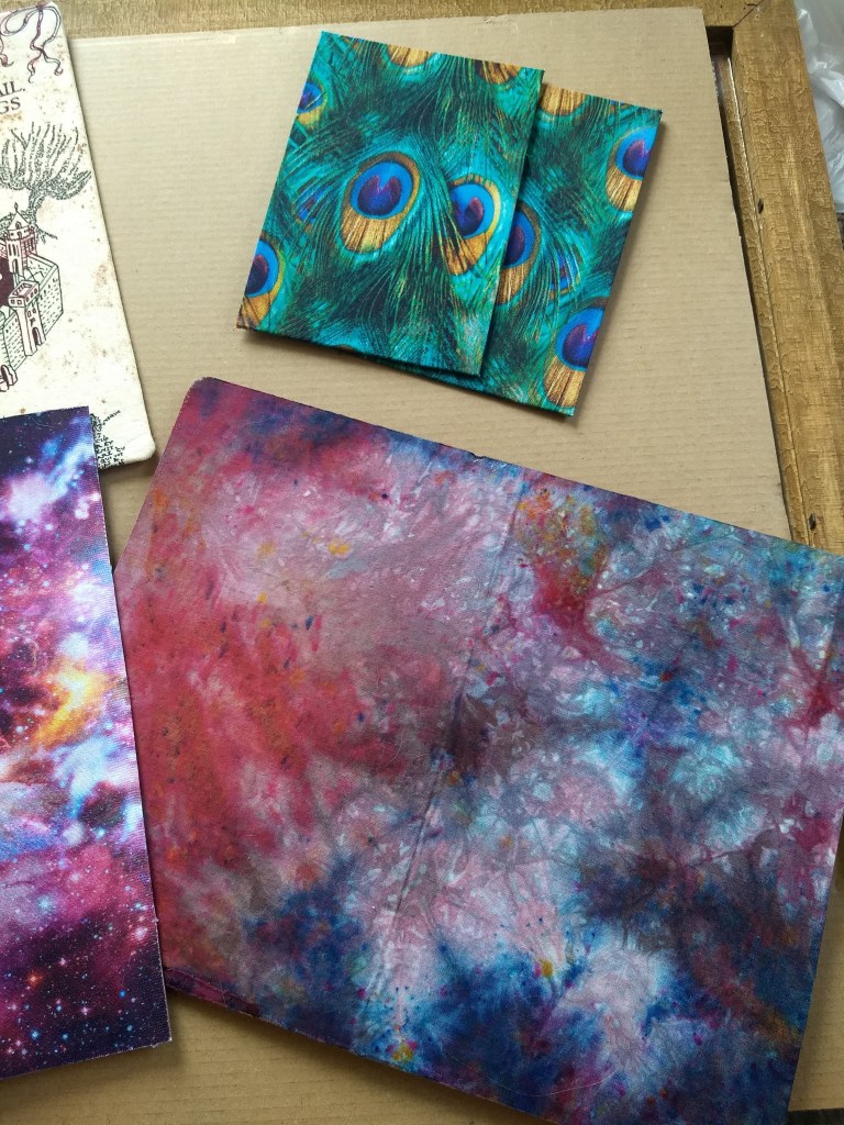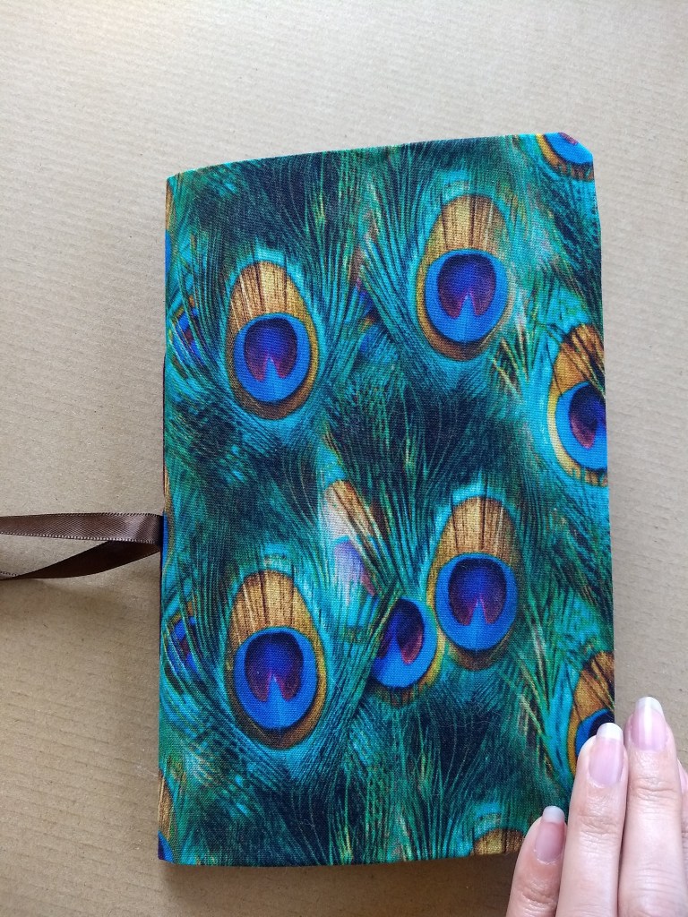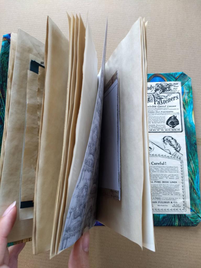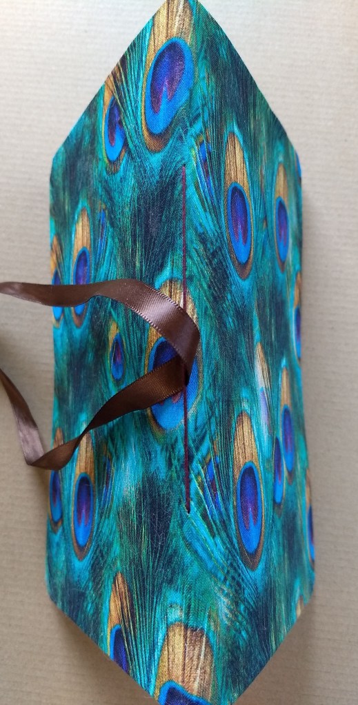 They’re all a little imperfect, though I think that’s part of their charm. First up is a simple, single signature pamphlet-bound journal made with my peacock fabric (which I did also make a mask out of for work). It’s about 5″ x8″, roughly, and I tried rounding the corners (which was an interesting challenge when gluing the cover fabric on).
