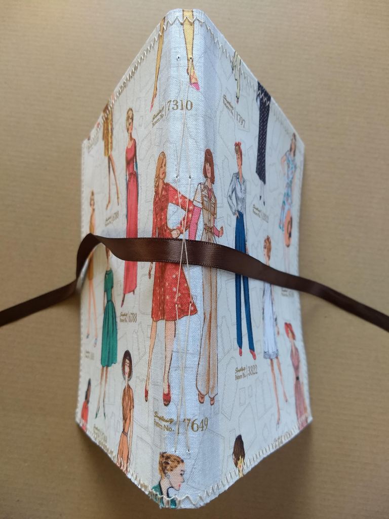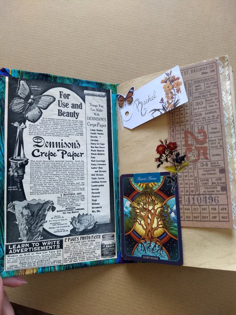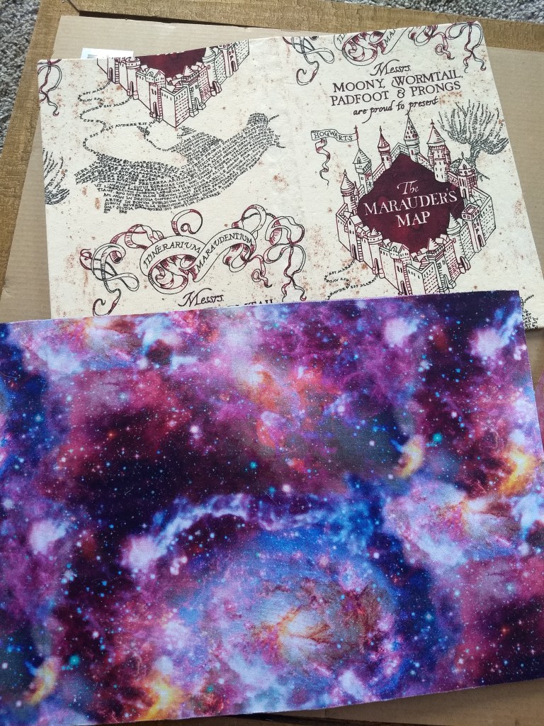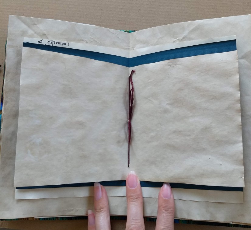 They’re all a little imperfect, though I think that’s part of their charm. First up is a simple, single signature pamphlet-bound journal made with my peacock fabric (which I did also make a mask out of for work). It’s about 5″ x8″, roughly, and I tried rounding the corners (which was an interesting challenge when gluing the cover fabric on).