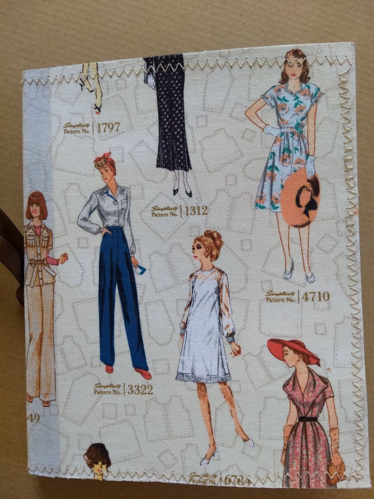 If anyone’s wondering, I used Aleene’s Tacky Glue to adhere all the fabric to cardboard covers that are roughly the thickness of cereal boxes. For the ones that aren’t wrapped (like the peacock journal) or sewn (like the Simplicity journal further down) I went around the edges with PVC glue, which we used in my book-binding classes, to keep the fabric edges from fraying.