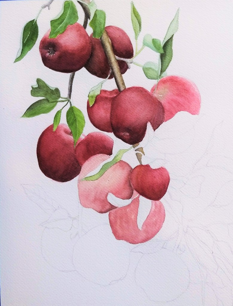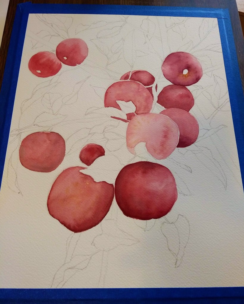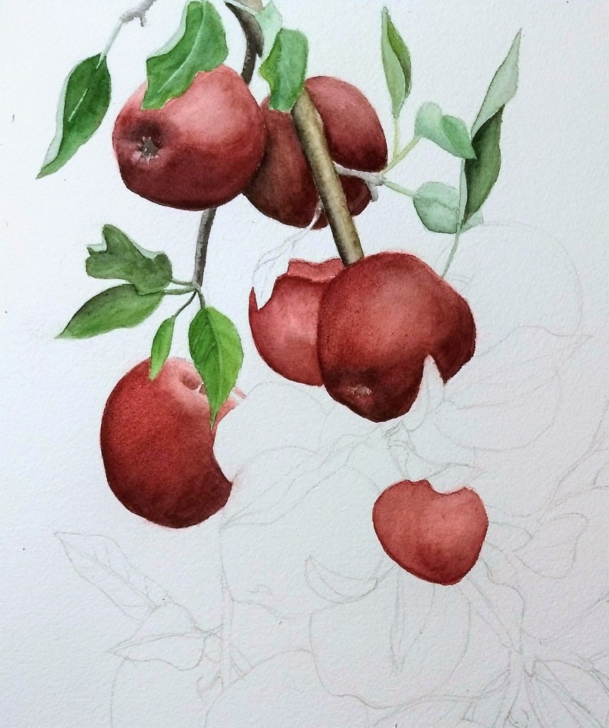 So I mentioned in a previous post that we made it to the apple orchard earlier this month, where I took photos; I’ve already gotten started with paintings from those.