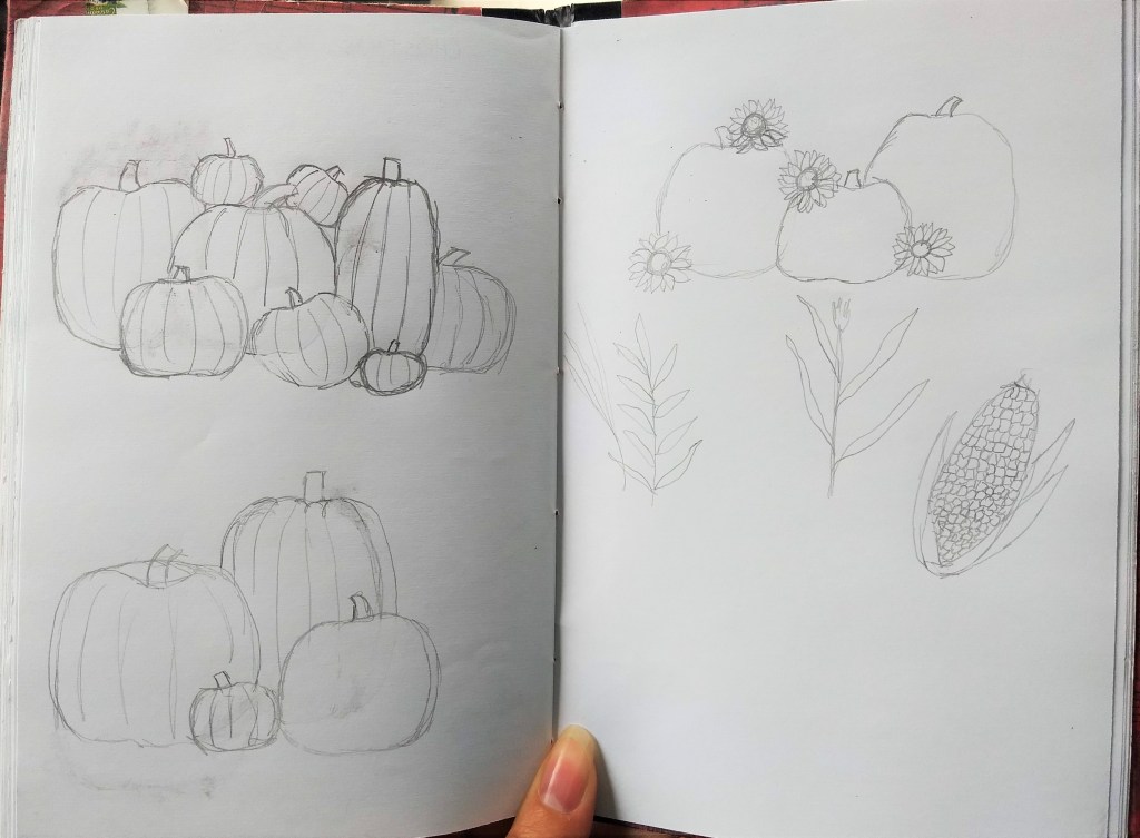 I’m also working on some ideas for a fall-themed “Paint it Yourself” kit for my Etsy shop. One of the four images will most likely feature apples, but I also sketched out some possible ideas for a pumpkin image. They’re pretty rough, but here they are: