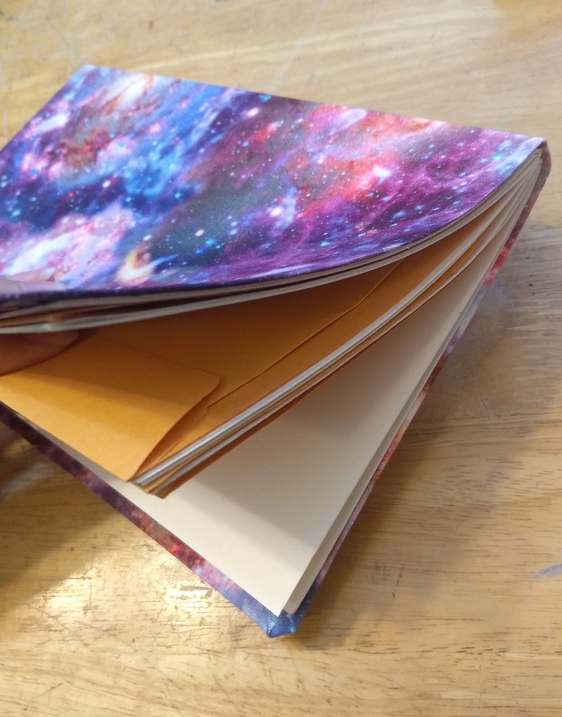 The journal has a fabric cover, and I altered and stitched in a couple of manila envelopes to make pockets in each signature. There’s also a sheet of watercolor paper in each signature along with sheets of drawing paper, which are a little thicker and sturdier than standard printer paper.