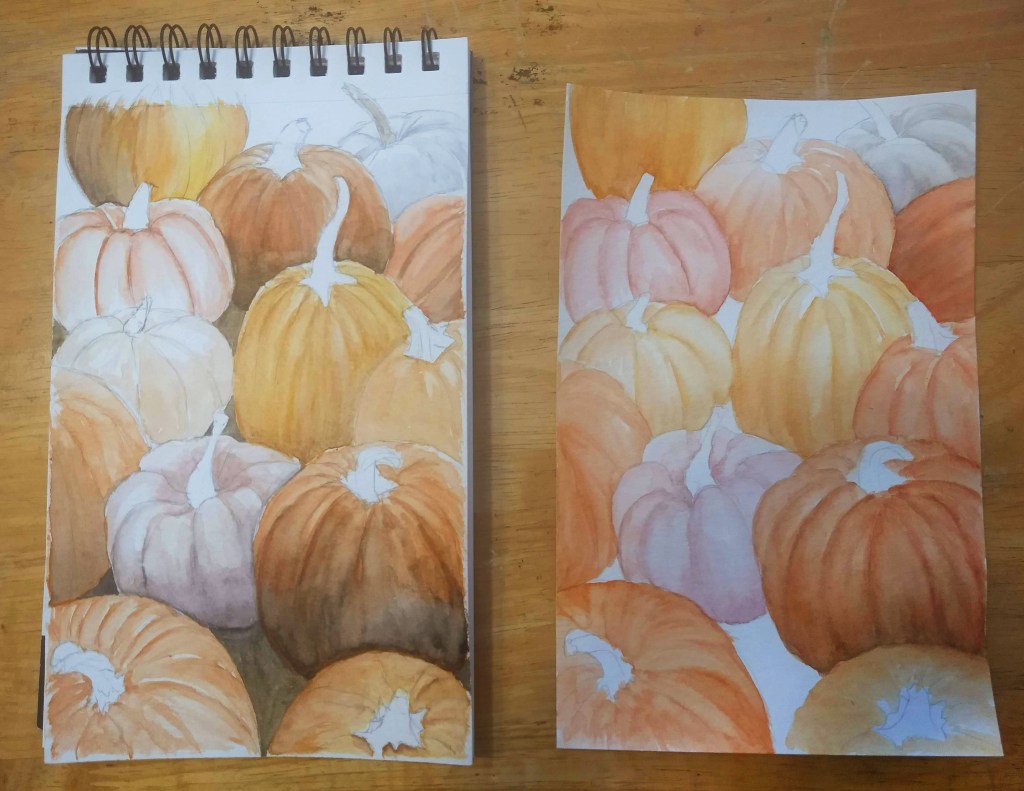 I also drew and painted some pumpkins, which are… not going as well as I’d like. I’m sure that the paper I’m using is a big factor; the apples are painted on Arches 100% cotton paper, while the two pumpkin paintings are on Strathmore paper (left) and Canson paper (right) (both papers are near the top of their respective lines, but still cellulose [plant-based, like most paper] rather than cotton). I’m going to keep working on them, but my hopes aren’t high. I want to include the sketched image in my fall-themed “Paint It Yourself” kit (which is still in the works!) but I may need to do a looser, simpler version for my demonstration piece.