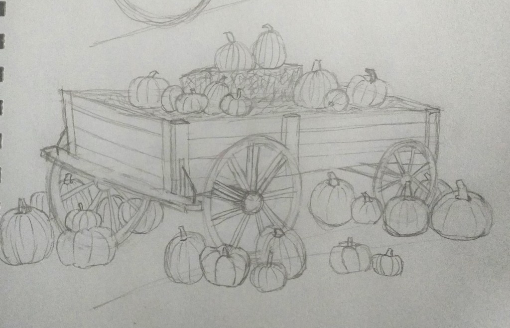 In thinking about my fall-themed kit, I also sketched a few other ideas for possible inclusion, including some leaves from my yard and a sketch from one of the pictures I took at the pumpkin patch that we visited in Alabama. There will probably be more of these sketches to come, since I haven’t made any final decisions yet. I should probably get moving on that if I want them to actually be done while it’s still fall.
