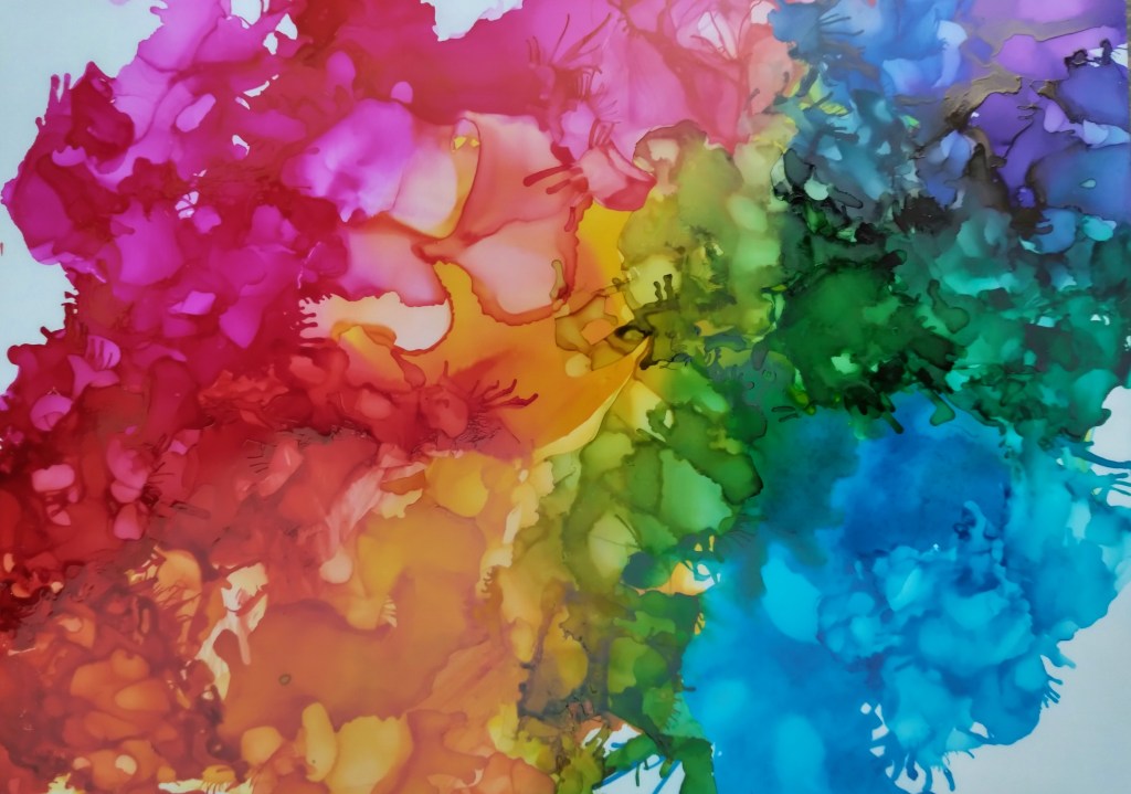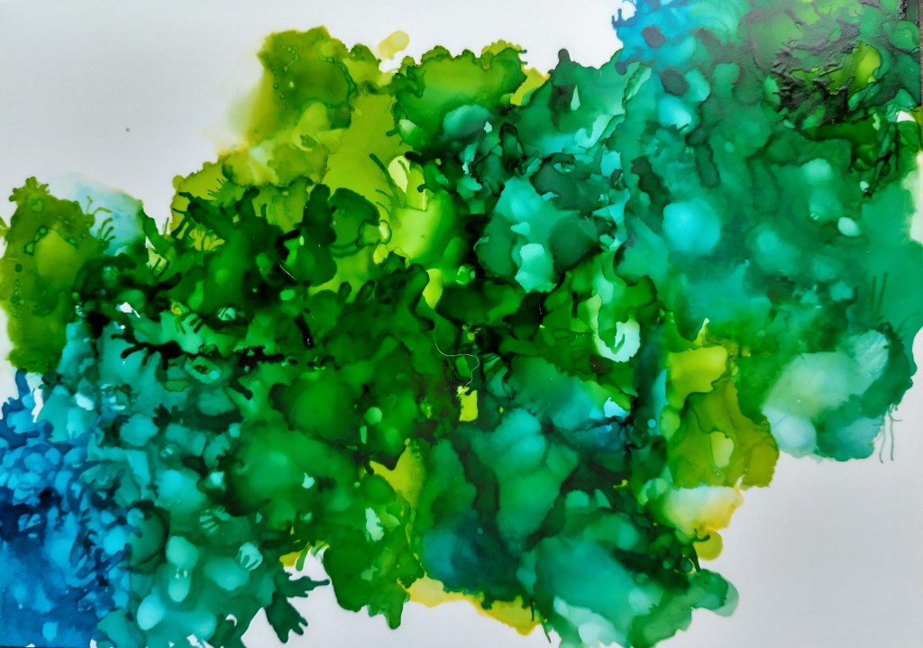 Anyway, just because I’m not painting doesn’t mean I’m not doing other things. I got it in my head that I might want to make a bunch of handmade books as table decor/party favors for our wedding (for real this time) so I started cutting and folding paper for that, which is particularly meditative for me right now (probably because my brain can pretty much totally check out and wander off where it will). I also finally got out and played with my alcohol inks, which I only sort of know how to use but find myself delighted with the results anyway. I feel like I don’t usually “get” abstract art (I like pattern and structure and meaning, it turns out) but with alcohol ink, the colors are fun and bright enough that I just don’t care if there’s anything else to “get.”