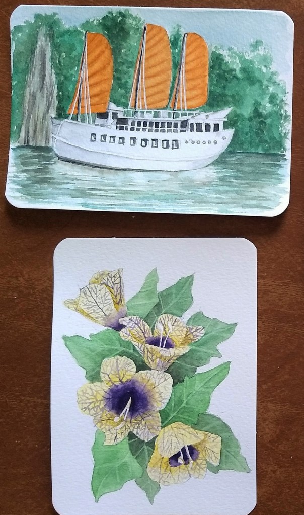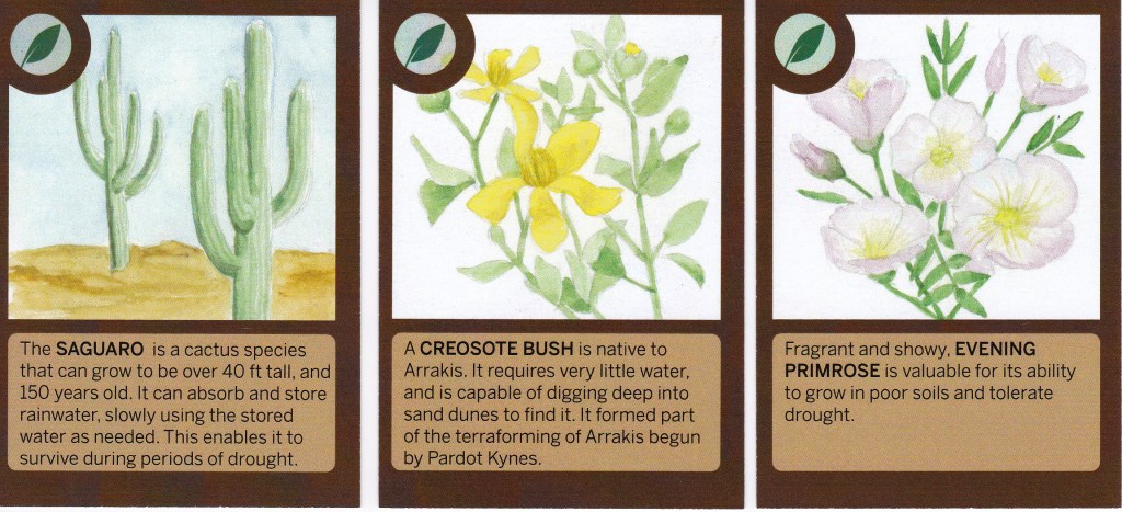 What makes it the “best” book club (or at least one of the most fun) is the book-related activities that our founder creates to go along with it. The first month, he had the idea to make Dune trading cards; he asked me and a couple other colleagues to help create the art. I got to do the plants. Each book club member got an initial set of cards, and by answering trivia questions in the week leading up to the meeting (which is on Zoom, at least for now) we could win more. (We also got envelopes marked to be opened only at the meeting, which contained the materials to make sand worm sock puppets… ridiculous and lots of fun).