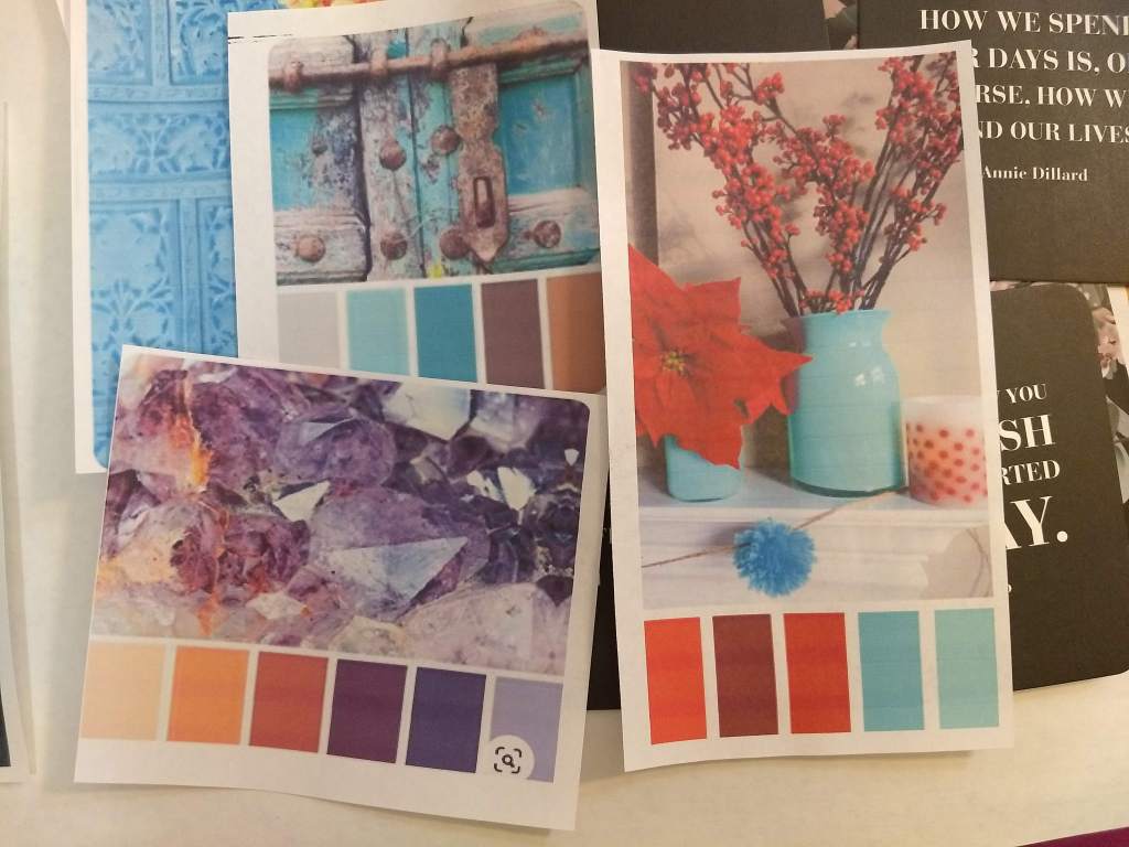 I started with a big sheet of drawing paper (it’s about 18×24) and printed some of the colorful pieces I’d saved on Pinterest; I have a board on there especially for color combinations and swatches that I like. Then I just started arranging them to fit on the larger paper, grouping a little by palette or theme and sticking in a couple quotes I liked.