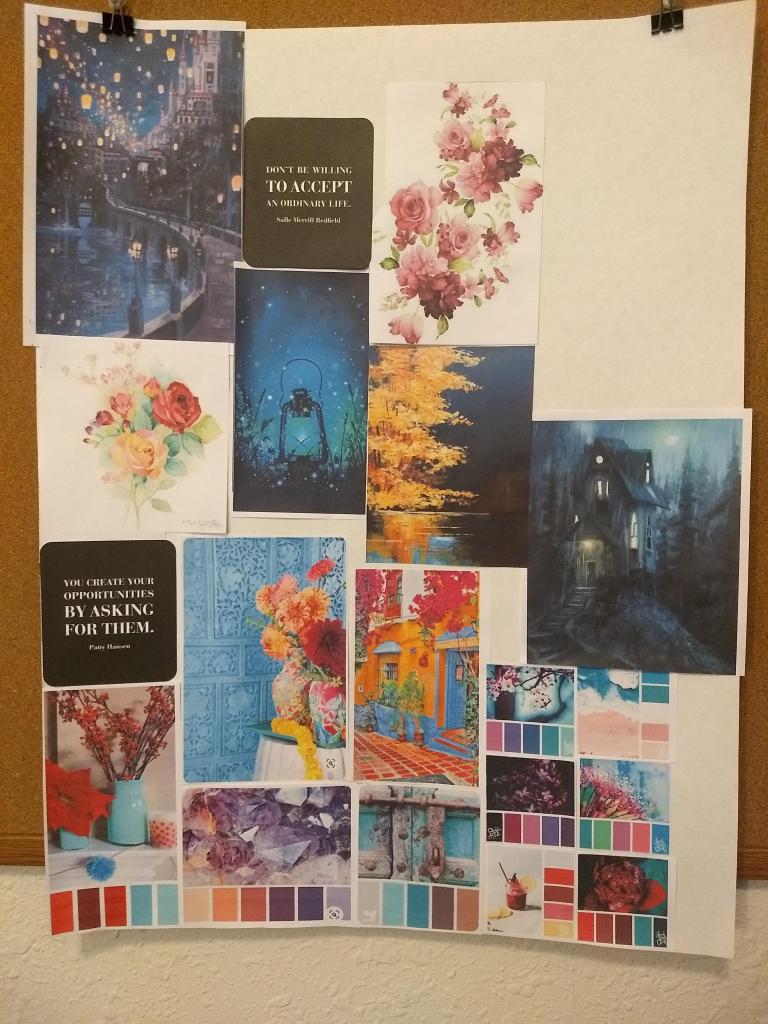 As an “artist,” I feel like I’m always in search of new sources of inspiration (especially now that one of my favorite ways to be inspired, travelling, is a little more restricted). Several of the artists I follow have something akin to a vision board, or a collection of colors, images, and textures that speak to them in some way. These collections might be virtual, in the form of a Pinterest board or Instagram bookmarks; I use both of these tools myself. However, as previously mentioned, I tend to get distracted when I put myself in front of a screen, so I decided to try the “analog” version of one of these vision boards.