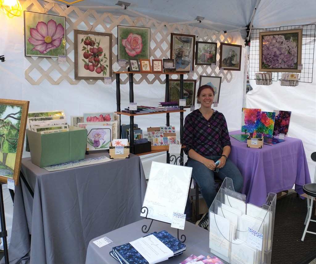 I’m happy to say that after about a two-year hiatus (thanks largely to the pandemic) I got to do an in-person market again last weekend. I had a tent up at Made Fest, which is part of Pygmalion, an annual literary and music festival in Champaign-Urbana. I honestly spent a big part of the last couple of months preparing (as might have been obvious from my most recent — and lack of recent — blog posts). I finished a couple of bigger painting projects, ordered new prints and stationery, and hand-stitched some new journals, figured out display ideas, bought a tent and some display stands…Thankfully Jake was around to help me load everything up and then set it all out.