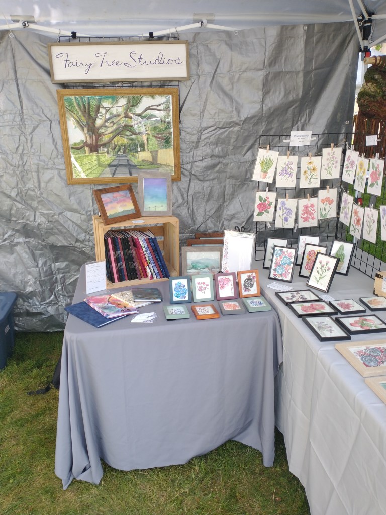 Speaking of markets, Fairy Tree Studios attended the Glorious Garden Festival in Bloomington, IL back in July, and it was a great success. I had both my best sales day to date on Saturday and my best market overall across the two days (Friday 7/15 and Saturday 7/16). Friday started off a little rough, as it rained all morning while I was setting up and into mid-afternoon during the market; given that most of what I sell is on paper, it was a challenge to keep everything dry! Thankfully nothing important got wet or ruined, though, and I sold some journals, stickers, and several small framed originals (including a couple of paintings to my booth neighbor, who was a fantastic neighbor to have [and not just because she bought my art!]).
