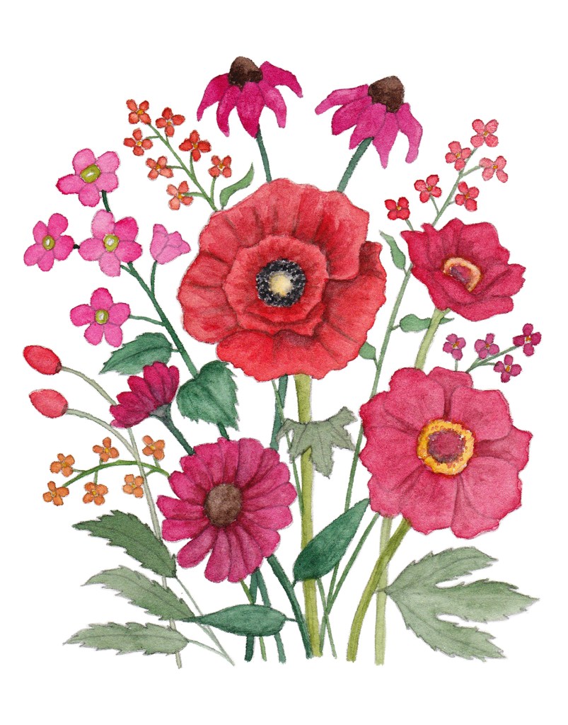 As promised last month, I’ve painted some new 5×7” note card designs, and also designed the first in a new group of A4 note cards which I’m sharing here for the first time (woo!). The red version is already available at the Vault, and I’m planning to create versions with blue, purple, and yellow flowers and put them in a set. The blue flowers are drawn and waiting to be painted, so you’ll probably see those here soon!