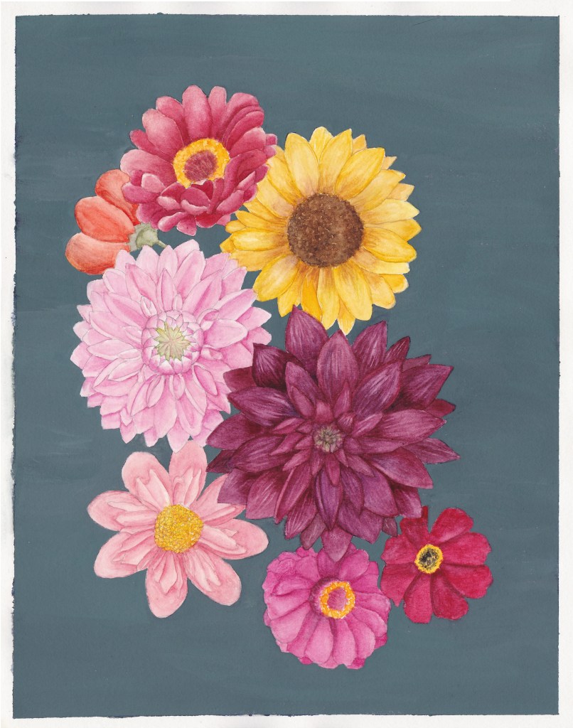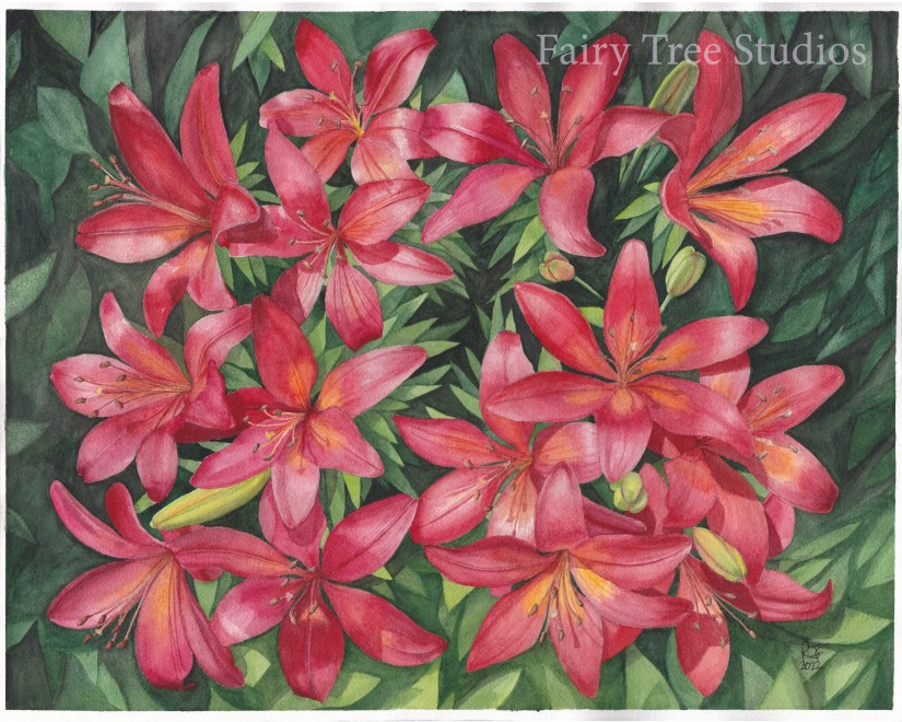 These are all watercolor paintings; the pieces in the top row are 5×7,” and the rest are 8×10.” Originals have all sold, but many prints are on Etsy.